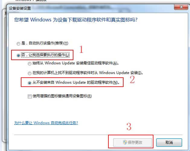 4:在弹出的“设备安装设置”菜单中选中第二项“否”-》“从不安装来自 Windows Update 的