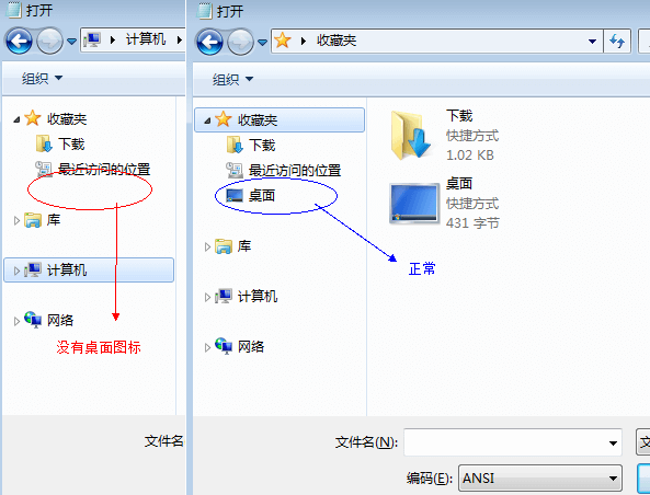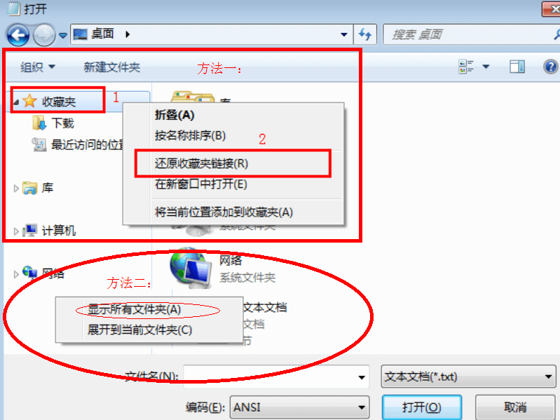 解决方法 方法一:右键“收藏夹”->“还原收藏链接”。 方法二:右键左框空白处->“显示所有文件夹”。 如图:
