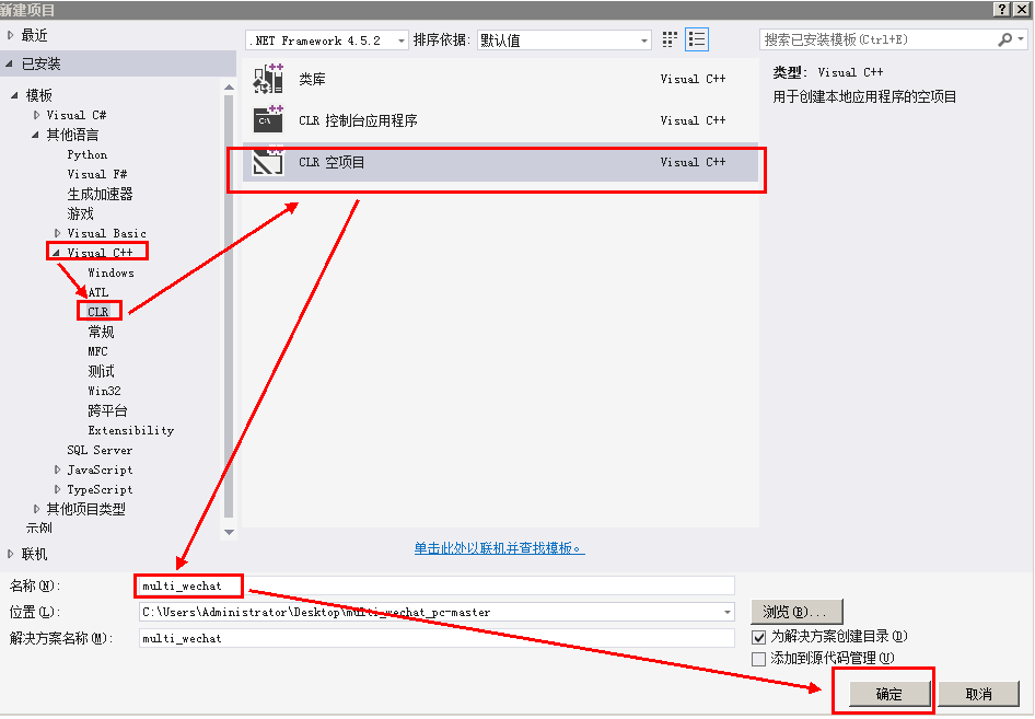 VS2010以及以前的版本,创建项目时都可以在CLR下找到“Windows窗体应用程序”的项目模板,但是VS2012以后的版本就没这么方便了。可以通过打开旧版本的项目来修改,也可以像下面这样操作: