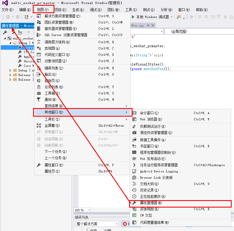 1.点击菜单栏"视图"->"其他窗口"->"属性管理器",从而调出属性管理器页面。