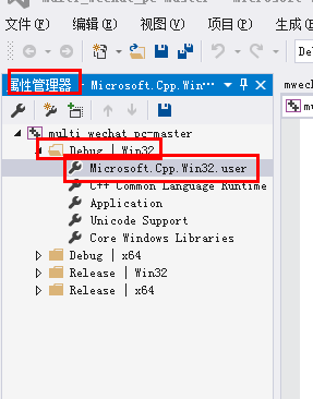 2.我的"属性管理器"页面是在 VS2015 窗口的右侧,然后在项目名称下找到"Debug | Win32"文件夹,双击"Microsoft.Cpp.Win32.user"。