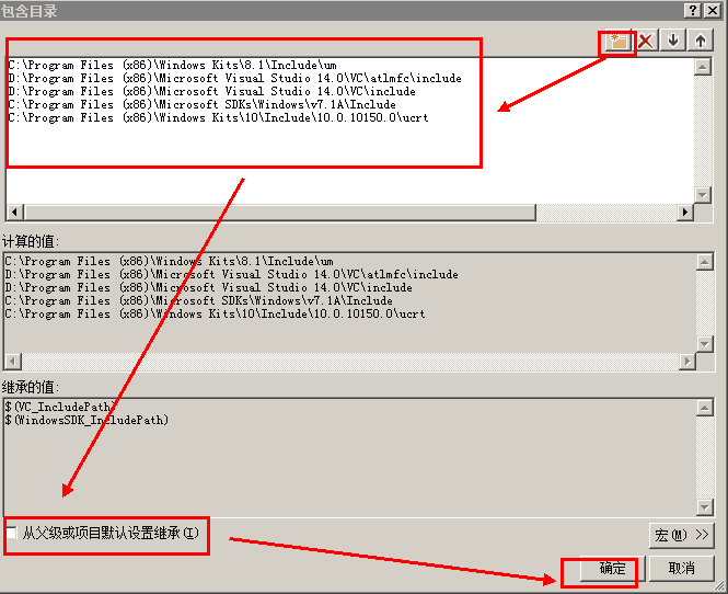 4.对于include环境变量的编辑,首先取消勾选"从父级或项目默认设置继承", 然后在最上方添加红框中的5条路径,点击确定。