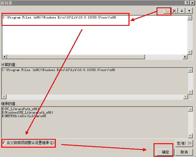 对于为什么之前的环境变量无法应用,网上普遍反映是VS2015中的一个Bug,而且我发现如果是选择"从父级或项目默认设置继承"时,在Windows Kits/10/include 和 Windows Kits/10/lib 目录下导入的是10.0.10240.0文件夹,但是我的本机目录下是10.0.10150.0文件夹,这是不一致的,这有可能导致了环境变量的配置错误,所以以上这种手工的配置方法是没问题的。