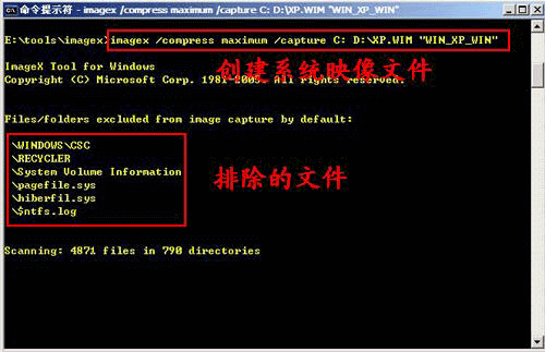 这样C盘的XP系统就备份到D盘,映像文件为XP.wim。从图上我们可以看出使用ImageX备份时,会开始扫描目录中的所有文件和文件夹,然后自动排除系统的页面文件、休眠文件等,这样创建出来的系统映像是最干净的,它可以节省不少的磁盘空间,这也是它比其它类似工具高明的地方。另外,在加了参数/compress maximum时,备份时间会稍长一些,但是映像文件的体积会小很多。在笔者的硬件平台上者测试备份一个XP系统大概需要5分钟,相比其他软件已经够快了。