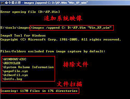 有的时候我们在利用Imagex创建完系统映像之后,又对系统做了某些优化或者修改,此时不用创建新的系统映像,我们只需利用ImageX的追加映像功能,即能将系统中的所有文件备份到一个已经存在的WIM映像中并替换其中的同名文件。当然除了系统映像之外,对于其它文件映像的追加完全一样。Imagex的这一特性很适合更新备份和增量备份。