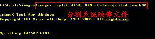 有时候由于映像文件太大刻盘或者传输不便,我们需要将创建出来的映像文件按照一定大小拆分,可以使用ImageX的“/split”参数。例如,如果我们希望将之前创建的XP.wim文件以640 MB为大小拆分,以便刻录到CD光盘上,那么可以使用这条命令:imagex /split D:\XP.wim d:\datasplited.swm 640