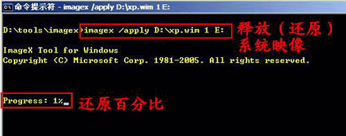 接着上面的任务释放系统映像,由于刚才用imagex备份时没有输入卷数,那就只要一个卷,在还原时就输入“1”。命令为:imagex /APPLY D:\XP.wim 1 E: 由于我们在当前系统的命令下进行演示,只能是否系统映像到非系统盘(比如E盘)。如果要实现对系统的还原,我需要在DOS界面或者Windows PE环境下进行。