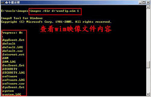 命令:IMAGEX /dir d:\system.wim >f:list.txt