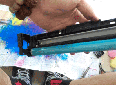 第八步:清废粉。鼓芯拿掉,充电辊拿掉,原装粉废粉少,不拆刮板直接从缝中倒掉也可以,刮板有胶黏住的,要用点力才能拿掉。
