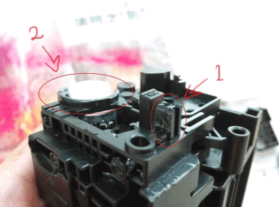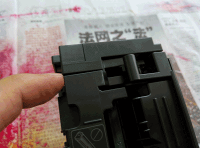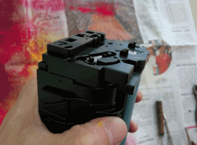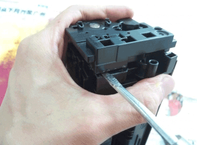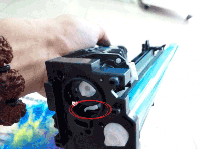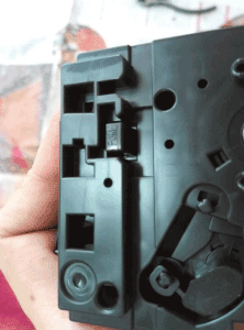 第五步:这个时候就要把废粉仓和加粉仓分离了,一定要注意另外一边的这个卡扣,它是另外一边齿轮的。我也不知道容不容易断,我没有弄过断的。