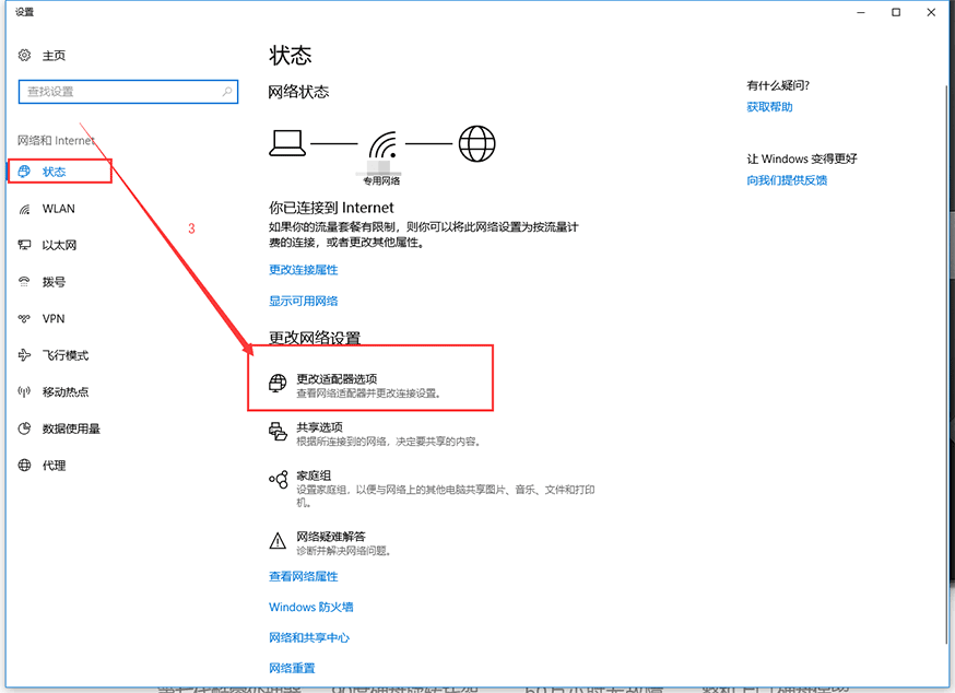 2:在打开的窗口中 状态 -> 更改适配器选项。