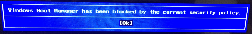 win10改win7提示"Windows Boot Manager has been blocked by the current security policy." 如图: