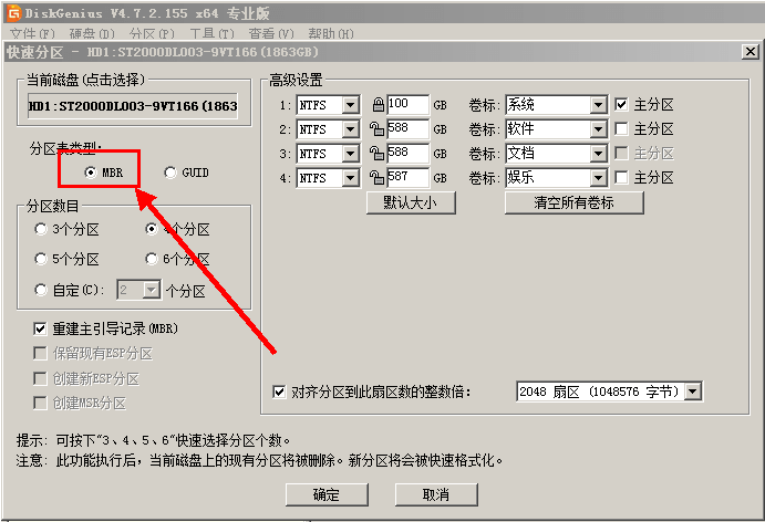 6. 启动PE进行硬盘分区,分区表类型选择MBR