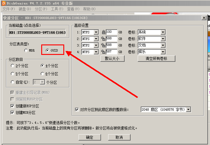 6. 启动PE进行硬盘分区,分区表类型选择GUID(也就是GPT)