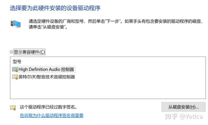 右键点击“英特尔智音技术音频控制器”选择 更新驱动程序 -> 浏览计算机上的驱动程序 -> 让我从计算机上的可用驱动程序列表中选取,然后在列表选择 "High Definition Audio控制器" 。