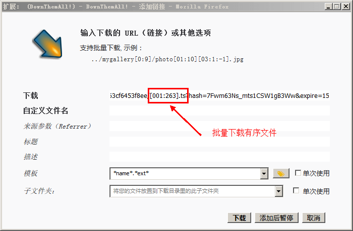 点击 downThemAll图标 -> 新建下载 -> 链接地址中把名字用[]括起指定范围。如:[001:800].ts 即可实现批量下载 如图: