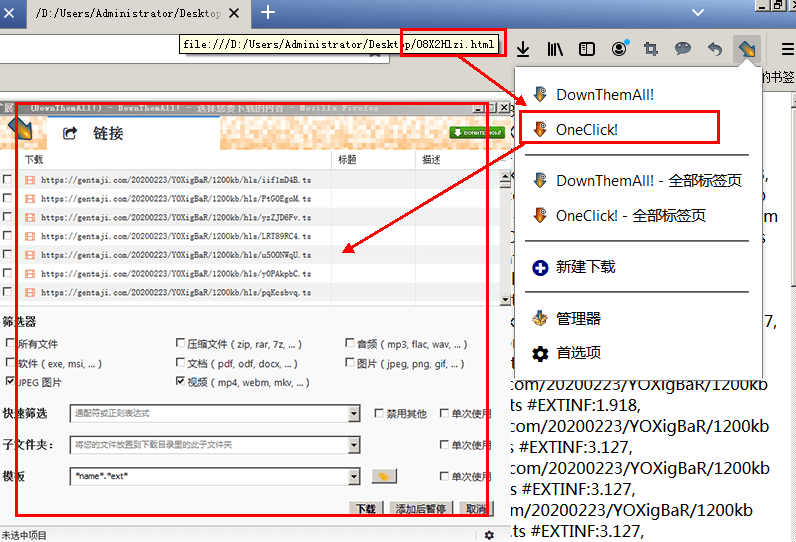 把m3u8文件括展名改为.html -> 使用火狐浏览器打开 -> 点击 downThemAll图标 -> OneClik! 如图:
