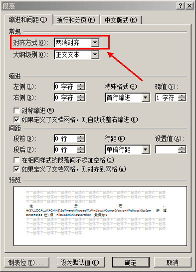 可以看到常规的“对齐方式”是【两端对齐】;如果整段都是纯文字,修改“对齐方式”为【左对齐】 -> 点击【确定】。