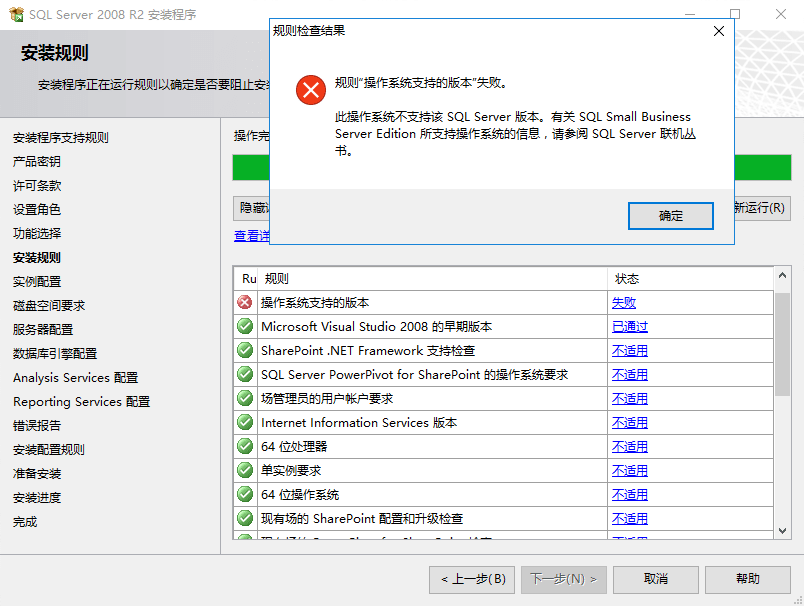 安装SQL Server 2008 R2 过程中 操作系统支持的版本 未通过 查看详情为: 规则“操作系统支持的版本”失败。此操作系统不支持该 SQL Server 版本。 有关 SQL Small Business Server Edition 所支持操作系统的信息,....。如图:
