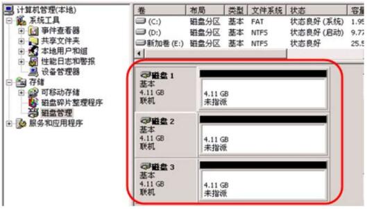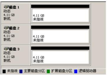 创建RAID-5卷至少前要三块硬盘,先在计算机上连接三块硬盘,连接好以后启动系统进入“磁盘管理”,可以看到三块新接的4.3GB的硬盘,如图1-9所示。
