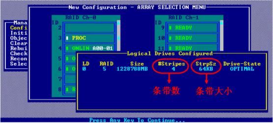 图1-15中“Stripes”就是指条带数,当前值为4,说明该RAID由4块物理盘组成。后面的“StrpSz"就是“StripeSize”,指条带大小,当前值为64KB,说明每个条带包含128个扇区。