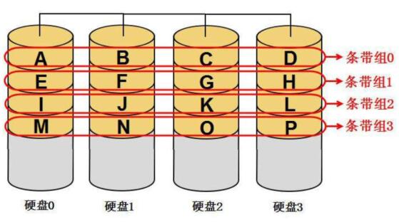 图1-16是一个RAID-0的结构,其中条带“A、B、C、D”都是每块成员盘中的0号条带,它们共同构成了“条带组0”,也称为“0号条带组”。