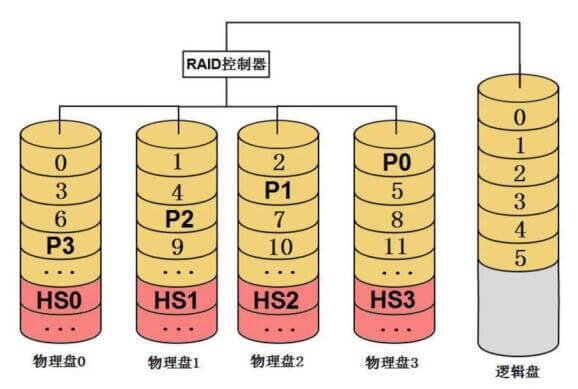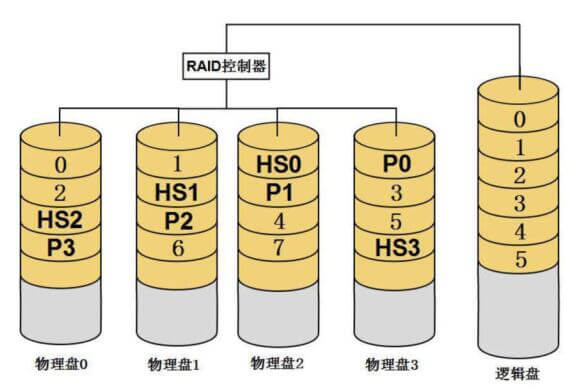 热备盘是指RAID中空闲、加电并待机的硬盘,当RAID中某个成员盘发生故障后,RAID控制器能够自动用热备盘代替故障磁盘,并通过算法把原来储存在故障磁盘上的数据重建到热备盘上,保证RAID的完整性。