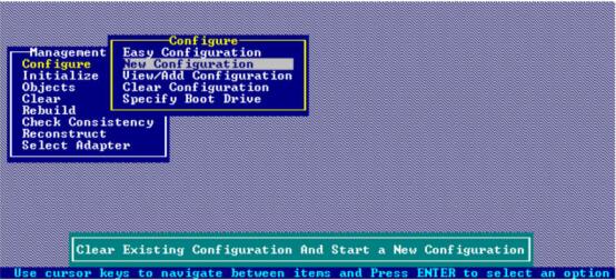 选择“Configure”下的“New ContioUration”,开始一个新的配置。如果原先己经配置过RAID,新的配置将会破坏原有配置,所以系统会询问是否继续,如图1-5所示。