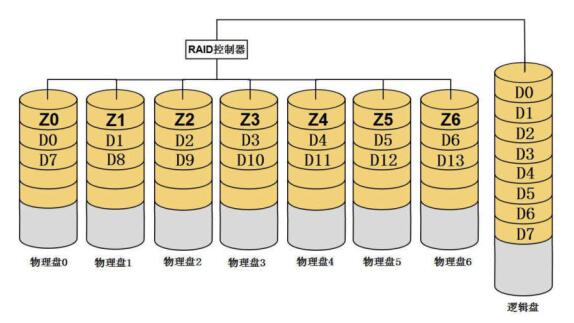ZZS编码RAID-6属于垂直校验形式,图1-53中3个条带组为一个运算单元,其中“Z0、Z1、Z2,Z3、Z4,Z5、Z6”分别是同一块成员盘中下面两个数据块经过ZZS算法计算出的校验值。