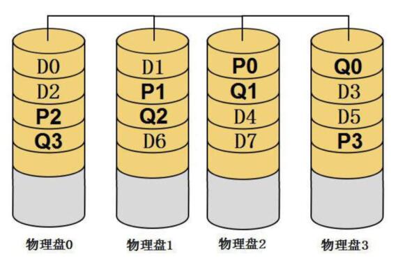 RAID-6中数据的分布与RAID-5相比,每个条带组中多出一个Q校验,如图1-55中的“Q0、Q1、Q2,Q3”就是Q校验。