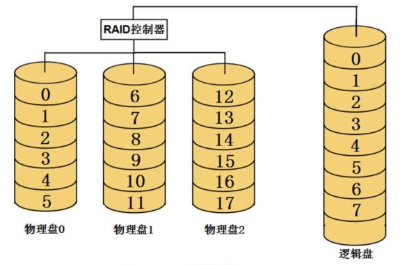 每块物理盘的条带都有一个编号,为了对应关系的明确,我们把条带编号也定义为从0开始,每块物理盘的第一个条带都称为0号条带,或者0号块,然后顺序往下编排。