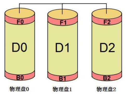 不过在很多JBOD中,数据在每块物理盘的起始位置并不是硬盘的第一个扇区,数据在每块物理盘的结束位置也不是硬盘的最后一个扇区,往往在物理盘的前部会留有一些扇区,如图1-57中的“F0、F1、F2”部分;在物理盘的尾部也会留有一些扇区,如图1-57中的“B0、B1、B2”部分,中间的“D0、D1,D2”才是真正的数据。