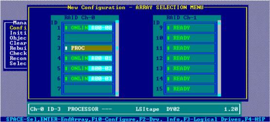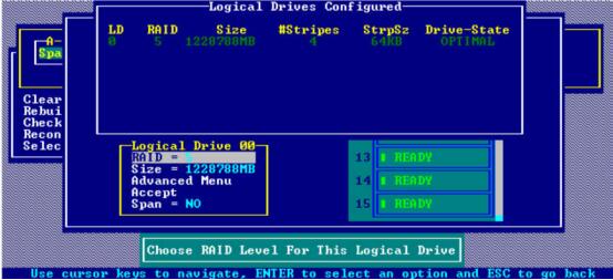 选中通道和硬盘后,按F10键进行配置,我们将这四块盘配置为RAID-5的类型,如图 1-7所示。