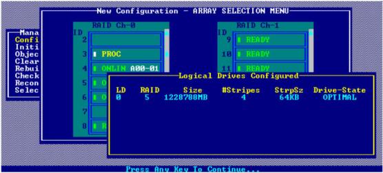 设置好配置项目后边“Accept”并回车,一个四块盘的RAID-5就配置好了,这时可以按F3键查看一下配置好的逻辑盘,如图1-8所示。