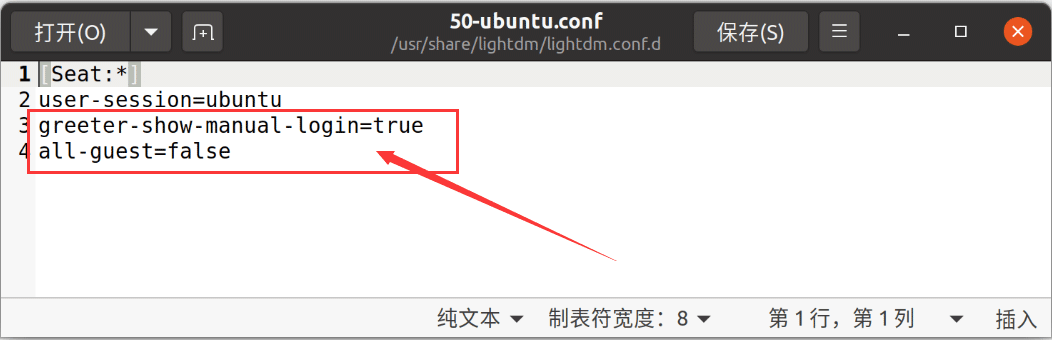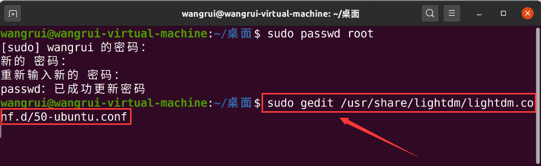 在终端输入命令:sudo gedit /usr/share/lightdm/lightdm.conf.d/50-ubuntu.conf