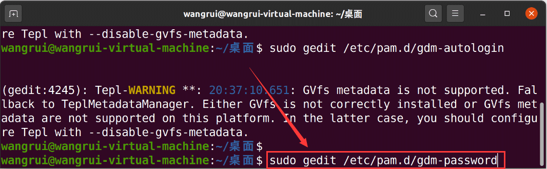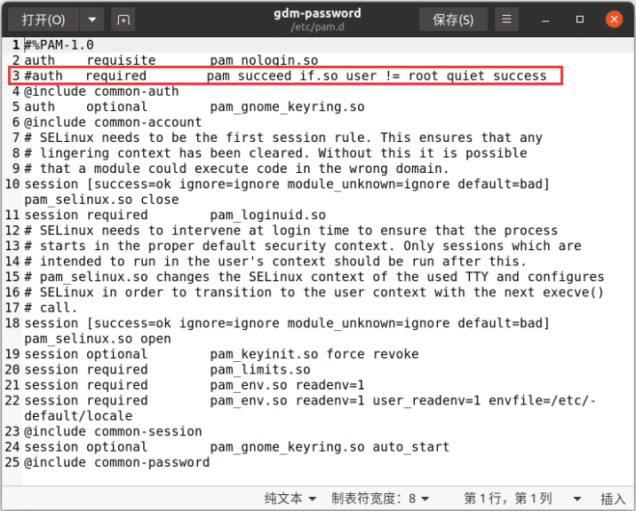 在终端输入命令:sudo gedit /etc/pam.d/gdm-password 打开文件
