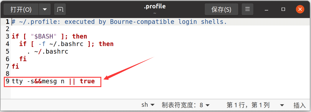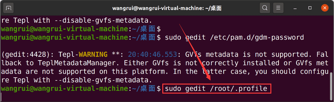 在终端输入命令:sudo gedit /root/.profile 打开文件