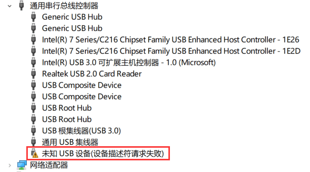 客户一台hp m126a打印机,经常有打印不了的情况,现在已经无法打印了。上门检修发现“设备和打印机”中该打印机为灰色(没有检测到打印机),然后在“设备管理器”中查看“通用串行总线控制器”有一个USB设备为黄色感叹号(设备工作异常),提示为“xxx(设备描述符请求失败)”没来得急截取现场图片,下图为网络借来的图片。