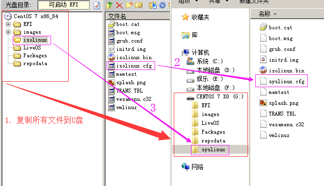 2. 复制ISO文件中的CentOS系统文件到U盘;然后把U盘中的isolinux\isolinux.cfg改名为syslinux.cfg,isolinux目录改名为syslinux。如图:
