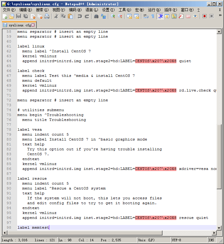 如把U盘卷标设为 "CENTOS 7 X8",配置文件中名称则为"CENTOS\x207\x20X8"(注:图中的“\x20”表示空格的意思)。