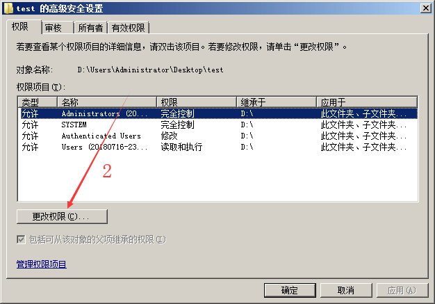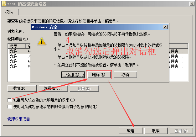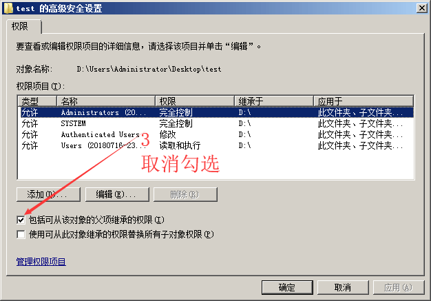 ->将“包括可以从该对象的父项的权限”前的勾选去除。