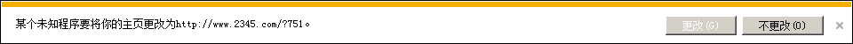 每次打开IE都提示“某个未知程序将你的主页更改为http://www.2345.com/?751。”,当然是点“不更改”,因为点的是“不更改 ”,所以每次打开IE都会提示。如图: