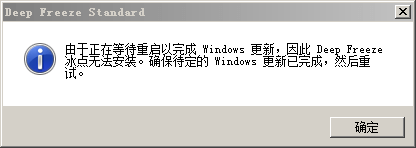 安装“冰点还原软件”或 对已安装的“冰点还原软件”进行冻结操作 提示“由于正在等待重启以完成 Windows 更新,因此 Deep Freeze冰点无法安装。确保待定的 Windows 更新已完成,然后重试”。如图: