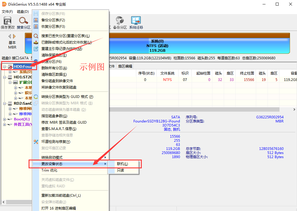 注:于是想把磁盘状态改为脱机来重现该问题,事实证明手动改磁盘状态为脱机后重启电脑磁盘会自动恢复为联机状态,也就不影响系统的引导。