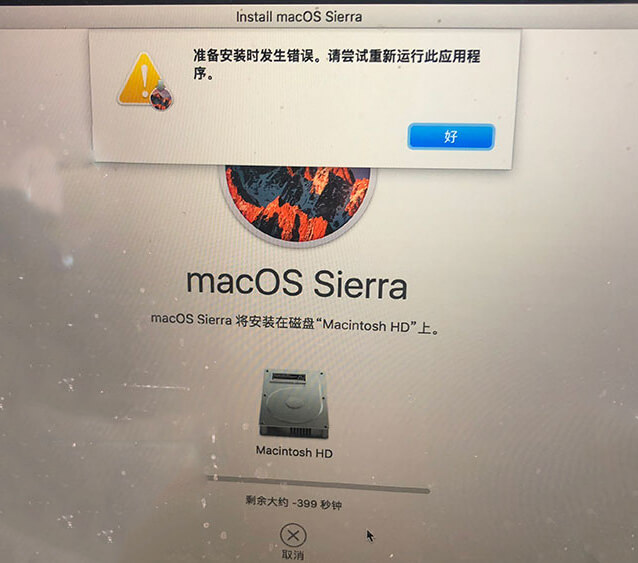 2. 使用 command + R 和 command + shift + option + R 组合键 进入“macOS 实用工具”->“重新安装 macOS”-> 选择磁盘,安装 进度条走到最后报“准备安装时发生错误,请尝试重新运行此程序”。