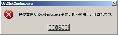 使用WinRAR把DiskGenius打包为单文件DiskGenius.exe,在win7下运行正常,移至2003PE运行报错,提示“映像文件 U:\DiskGenius.exe 有效,但不适用于此计算机类型。” 如图: