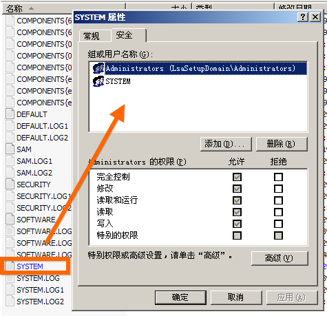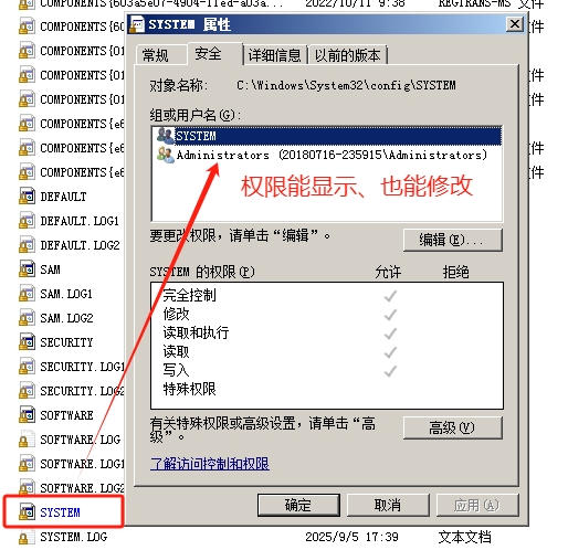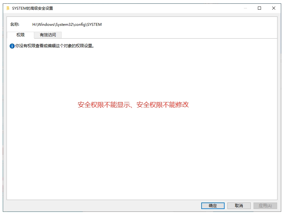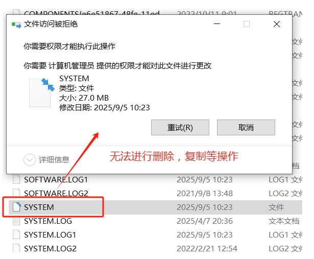 经过简单排查确定是本机系统“C:\Windows\System32\Config\SYSTEM”的注册表文件没有操作权限。