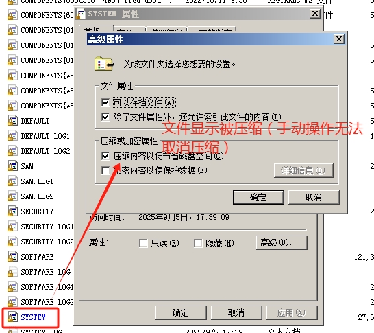 1.文件显示被压缩(手动操作无法取消压缩),2.权限中所有者为“Administrator”。