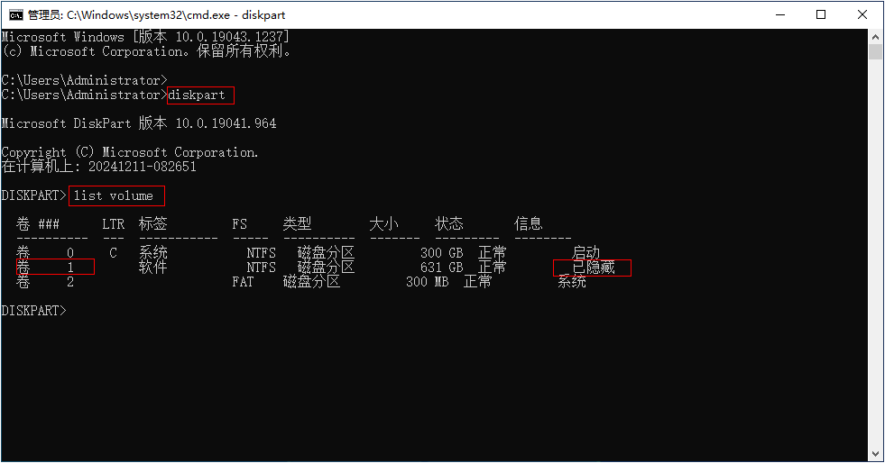 3. 再次输入 list volume 查看“卷 1”信息,可以看到已经没有隐藏属性了。