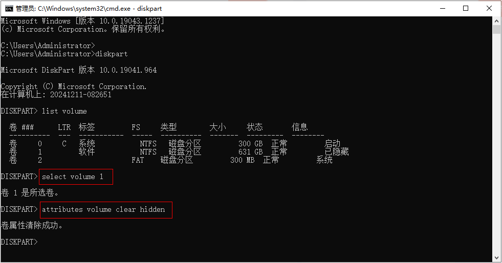 2. 输入 select volume 1 选中“卷 1”进行操作,再输入 attributes volume clear hidden 取消“卷 1”的隐藏属性。